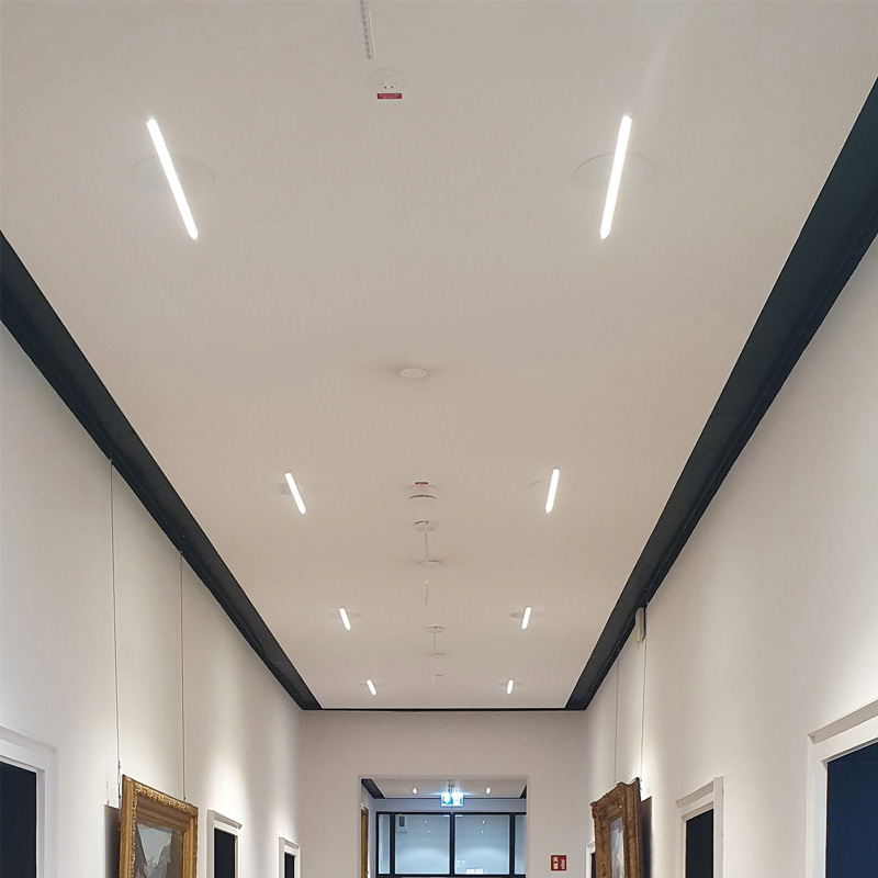 In the corridor areas, outdated downlights were upgraded to a high-end linear lighting system using the Lumami Downlight with the LTwo CC25-60° in a 562mm length. This transformation was achieved using the existing ceiling cutouts — turning point lighting into linear lighting without altering the building’s architecture.